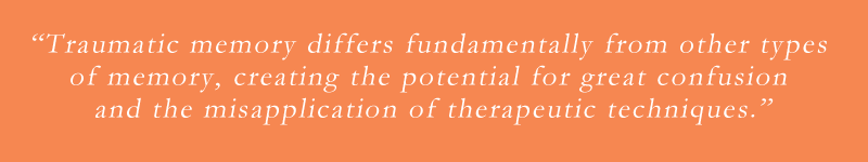 Perhaps nowhere in the field of trauma is there more confusion than with the role of traumatic memory in both pathology and healing. Indeed, research studies conducted by different laboratories frequently appear to contradict one another. In addition, clinicians and academics rarely communicate with each other—a very unfortunate state of affairs. Most importantly, traumatic memory differs fundamentally from other types of memory, creating the potential for great confusion and the misapplication of therapeutic techniques.